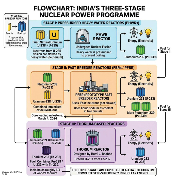 - The nuclear physicist Homi Bhabha is widely credited with conceiving India’s nuclear programme in the first years of its independence. The programme has three stages. In the first stage, PHWRs will use natural uranium to produce plutonium and depleted uranium and electricity. In the second stage, FBRs will use the plutonium and depleted uranium from the first stage to produce even more plutonium and electricity. Finally, future nuclear reactors will use plutonium and thorium to produce electricity.