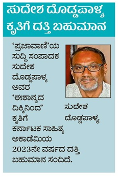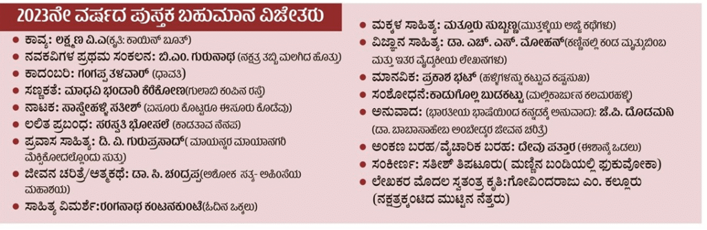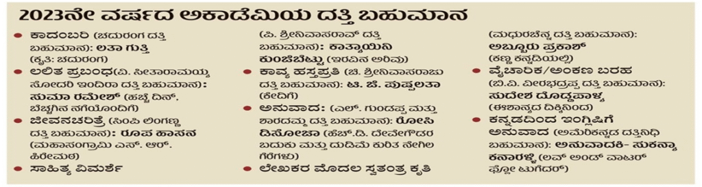 - ‘ನಗರದಲ್ಲಿ ನಡೆದ ಅಕಾಡೆಮಿಯ ಸರ್ವಸದಸ್ಯರ ಸಭೆಯಲ್ಲಿ ಪ್ರಶಸ್ತಿಗಳಿಗೆ ಸಾಹಿತಿಗಳು ಹಾಗೂ ಕೃತಿಗಳನ್ನು ಆಯ್ಕೆ ಮಾಡಲಾಗಿದೆ. ಮೈಸೂರು, ತುಮಕೂರು ಇಲ್ಲವೇ ಬೆಳಗಾವಿಯಲ್ಲಿ ಸದ್ಯವೇ ಪ್ರಶಸ್ತಿ ಪ್ರದಾನ ಮಾಡಲಾಗುವುದು.