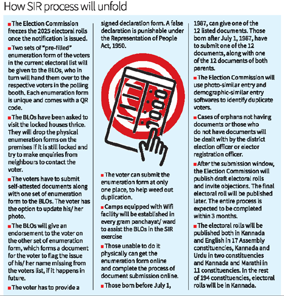 Context: Amid the row over the Special Intensive Revision (SIR) of electoral rolls in Bihar, the Election Commission of India (ECI) is gearing up to launch an SIR of voter lists in Karnataka, anytime after September 25.