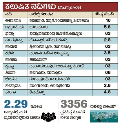 ಸಂದರ್ಭ: ಕರ್ನಾಟಕದ ನಗರ ಮತ್ತು ಪಟ್ಟಣ ಪ್ರದೇಶಗಳ ಕೊಳಚೆ ನೀರು ಹಾಗೂ ಆಯಾ ಜಲಾನಯನ ಪ್ರದೇಶಗಳಲ್ಲಿನ ಕೈಗಾರಿಕೆಗಳ ತ್ಯಾಜ್ಯ ಸೇರುತ್ತಿರುವುದರಿಂದ 12 ನದಿಗಳು ಕಲುಷಿತಗೊಂಡಿವೆ.