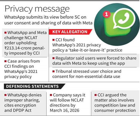 - WhatsApp said it would fully comply with the NCLAT directions relating to user consent for sharing data with Meta under its controversial 2021 privacy policy by March 16, 2026. The tribunal had, however, found the CCI’s five-year ban on sharing data for advertisement purposes “redundant”, considering that the user had already been given a choice to opt in or out.