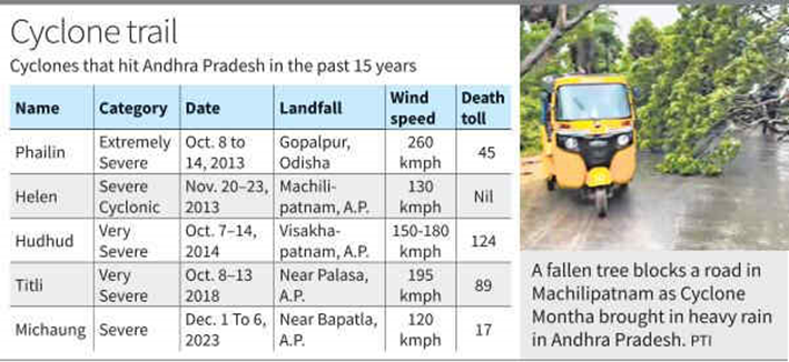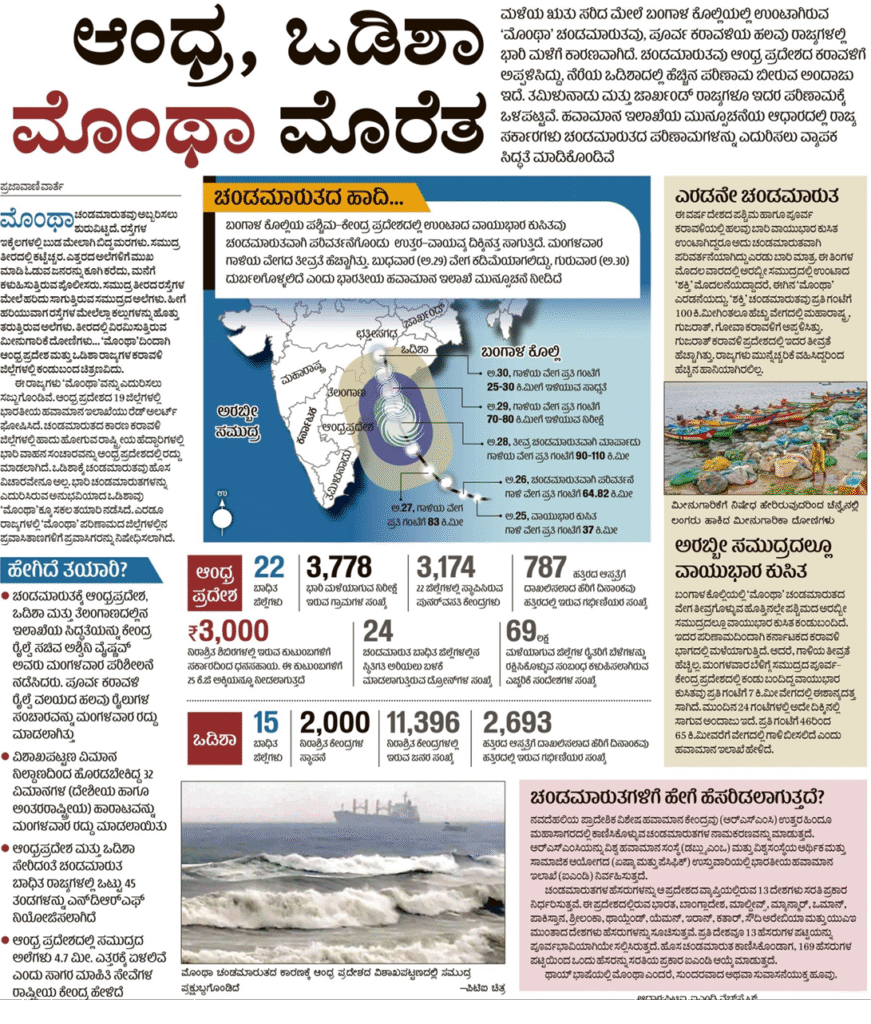 ಸಂದರ್ಭ: ‘ಮೊಂಥಾ ಚಂಡಮಾರುತದ ತೀವ್ರತೆ ತಗ್ಗಿದೆ ಎಂದು’ ಎಂದು ಭಾರತೀಯ ಹವಾಮಾನ ಇಲಾಖೆ ಬುಧವಾರ ಹೇಳಿದೆ. ಚಂಡಮಾರುತದ ಪರಿಣಾಮವು ಆಂಧ್ರ ಪ್ರದೇಶ ಮತ್ತು ತೆಲಂಗಾಣಕ್ಕೆ ತೀವ್ರವಾಗಿ ತಟ್ಟಿದೆ. ಒಡಿಶಾದಲ್ಲಿ ಭೂಕುಸಿತ ಸಂಭವಿಸಿದೆ, ಜಾರ್ಖಂಡ್ನಲ್ಲಿ ಮಳೆಯಾಗಿದೆ.