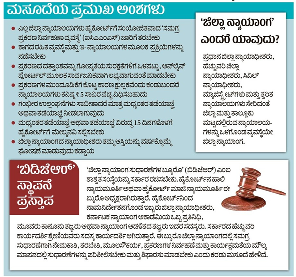 ಈ ಉದ್ದೇಶದಿಂದ ‘ಕರ್ನಾಟಕ ಜಿಲ್ಲಾ ನ್ಯಾಯಾಂಗ ಸುಧಾರಣೆಗಳ ಮಸೂದೆ– 2025’ರ ಕರಡು ಸಿದ್ಧಗೊಂಡಿದೆ. ಬೆಳಗಾವಿ ಅಧಿವೇಶನದಲ್ಲಿ ಈ ಮಸೂದೆ ಮಂಡಿಸುವ ತಯಾರಿಯೂ ನಡೆದಿದೆ.