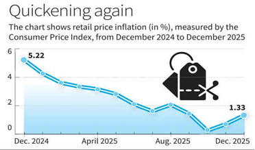 - India’s retail inflation quickened to a three-month high of 1.33% in December 2025, which is still significantly below the lower comfort level of 2% set by the Reserve Bank of India (RBI), official data released showed.